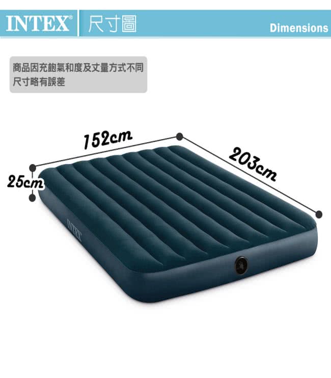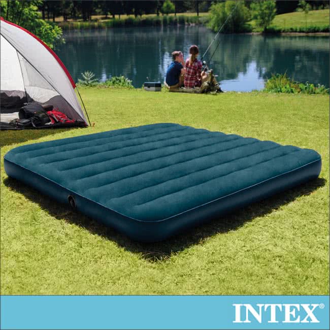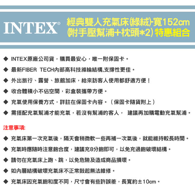 一起來看看這款【INTEX】經典雙人加大充氣床墊/綠絨-寬152cm-特惠組合-附手壓幫浦+枕頭*2(64736)吧!!!