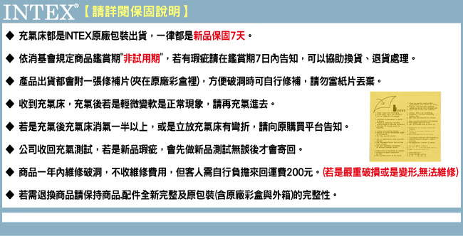 ◆ 充氣床屬消耗品,使用壽命依個人使用有所不同,新品保固7天,破洞保修一年。